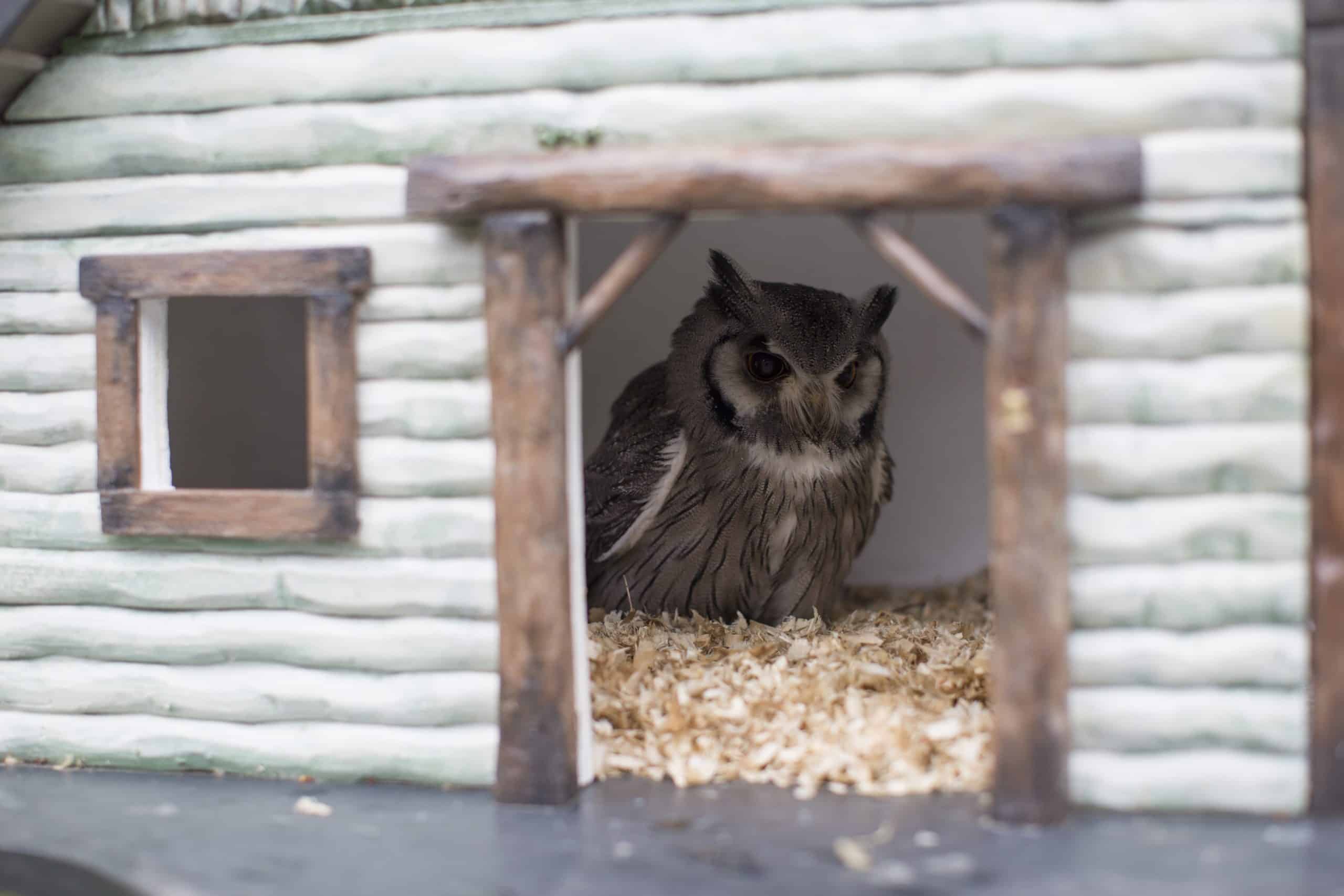 juni 2020 – Smeagol, onze witwangdwergooruil (= langste woord ooit!) is deze lente bij ons komen wonen. Nu zijn buitenverblijf gebouwd en geschilderd is, moet hij nog een huisje hebben, waar hij tegen regen en wind zou kunnen schuilen. Na lang onderhandelen, ging hij toch akkoord met een mini-blokhut.
