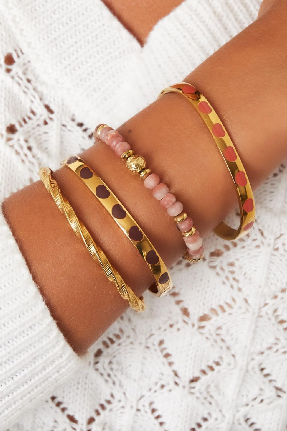 Deze prachtige armband is geheel versierd met groene kralen gemaakt van steen, met daartussen gouden kralen gemaakt van hematiet. Leuk voor het najaarsseizoen en perfect te matchen met verschillende herfst outfits. Het materiaal van de gekleurde kralen is African Pine Stone. De lengte van de armband is 17 cm en is te verlengen met 3 cm.